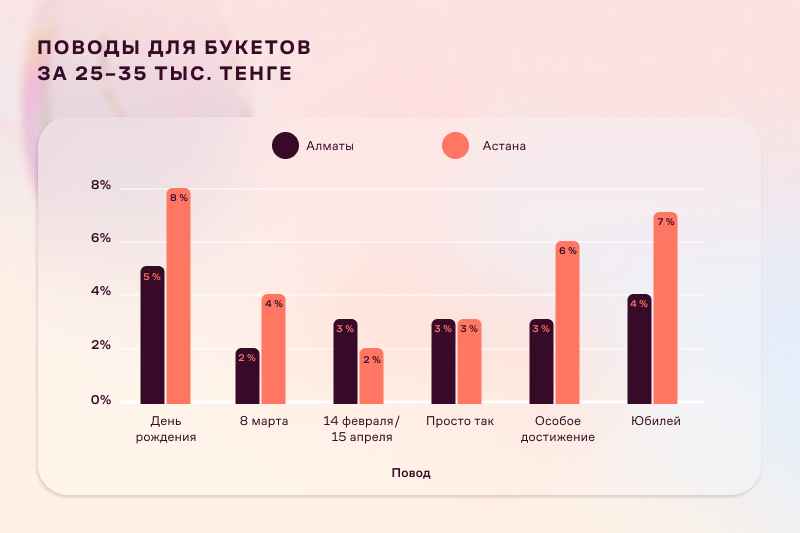 Разные модели покупок отражают, что цветы занимают разное место в жизни двух городов. Алматы, несмотря на интерес к эффектным и дорогим букетам, остается в рамках сезонного спроса и подарков по случаю. Астана демонстрирует другую логику потребления: букеты дарят без повода, а спрос остается высоким даже вне праздников.