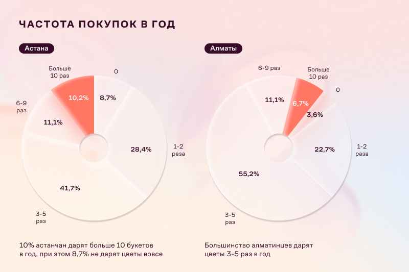 17% жителей Астаны готовы тратить больше 30 тысяч тенге на семейные праздники. Еще 10% выбирают бюджет в 25–35 тысяч тенге для букетов на дни рождения. При этом рациональность сохраняется — почти три четверти опрошенных смотрят на цену букета. В Астане заметна полярность: 10% жителей покупают цветы больше 10 раз в год, а 8,7% — ни разу.