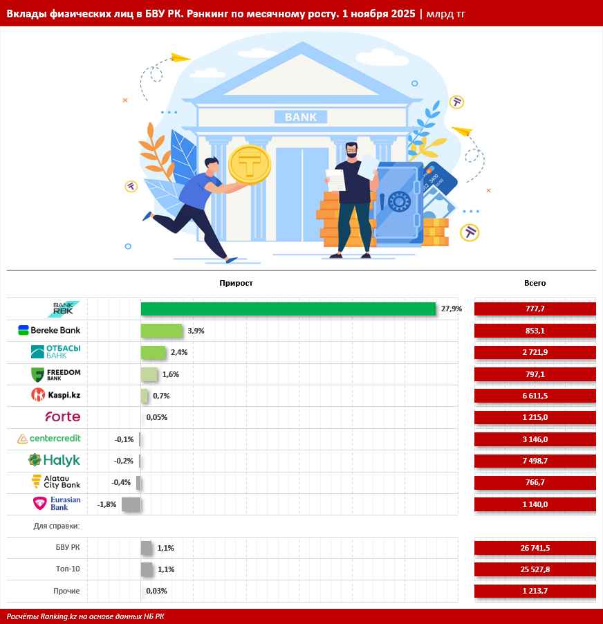 Среди крупнейших банков страны уверенно лидирует по месячному росту вкладов населения Bank RBK: плюс 27,9% (или 169,7 млрд тенге), до 777,7 млрд тенге. Второе место по месячному росту среди ключевых БВУ РК занял Bereke Bank: плюс 3,9%, до 853,1 млрд тенге. Замыкает тройку лидеров специализирующийся на системе жилстройсбережений Отбасы банк: плюс 2,4%, до 2,7 трлн тенге.