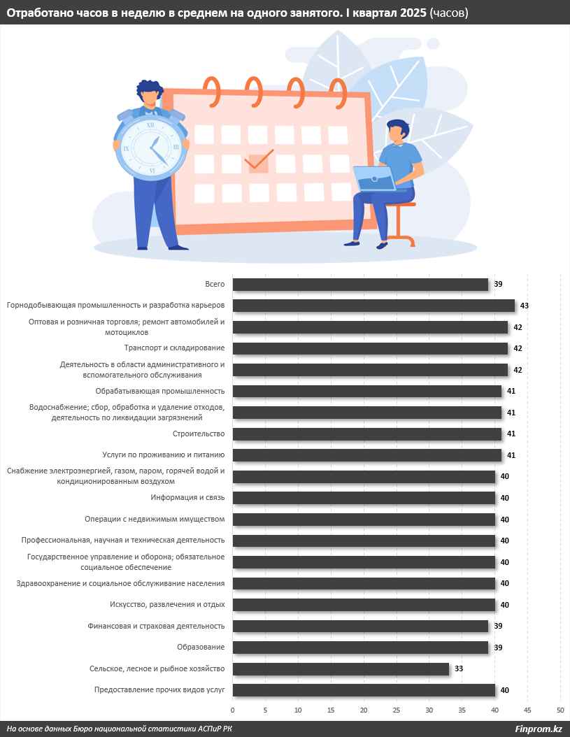 В разрезе основных отраслей экономики чаще всего перерабатывают работники горнодобывающей промышленности и разработки карьеров — в среднем на одного занятого здесь приходится 43 часа в неделю. По 42 часа в неделю в среднем трудятся сотрудники в оптовой и розничной торговле, ремонте автомобилей и мотоциклов, а также в секторе транспорта и складирования и в сфере административного и вспомогательного обслуживания. По 41 часу в неделю работают занятые в обрабатывающей промышленности, водоснабжении и утилизации отходов, строительстве и в сфере предоставления услуг по проживанию и питанию.