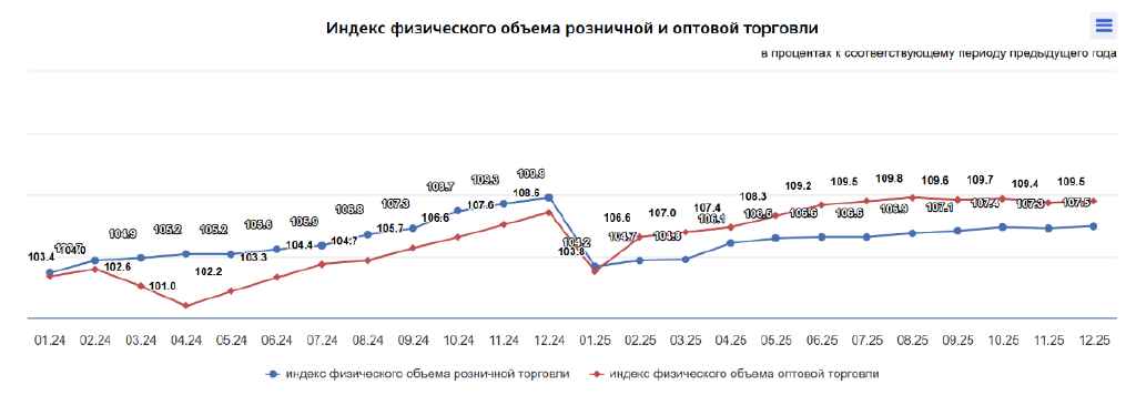 Согласно данным, опубликованным Бюро национальной статистики Агентства по стратегическому планированию и реформам Республики Казахстан, объем розничной торговли в январе-декабрь 2025г. составил 26 392 млрд. тенге, что на 7,5% больше уровня соответствующего периода 2024г. Розничная реализация товаров торгующими предприятиями увеличилась на 5,9%, индивидуальными предпринимателями, в том числе торгующих на рынках, увеличилась на 10,3% по сравнению с январем-декабрем 2024г.
